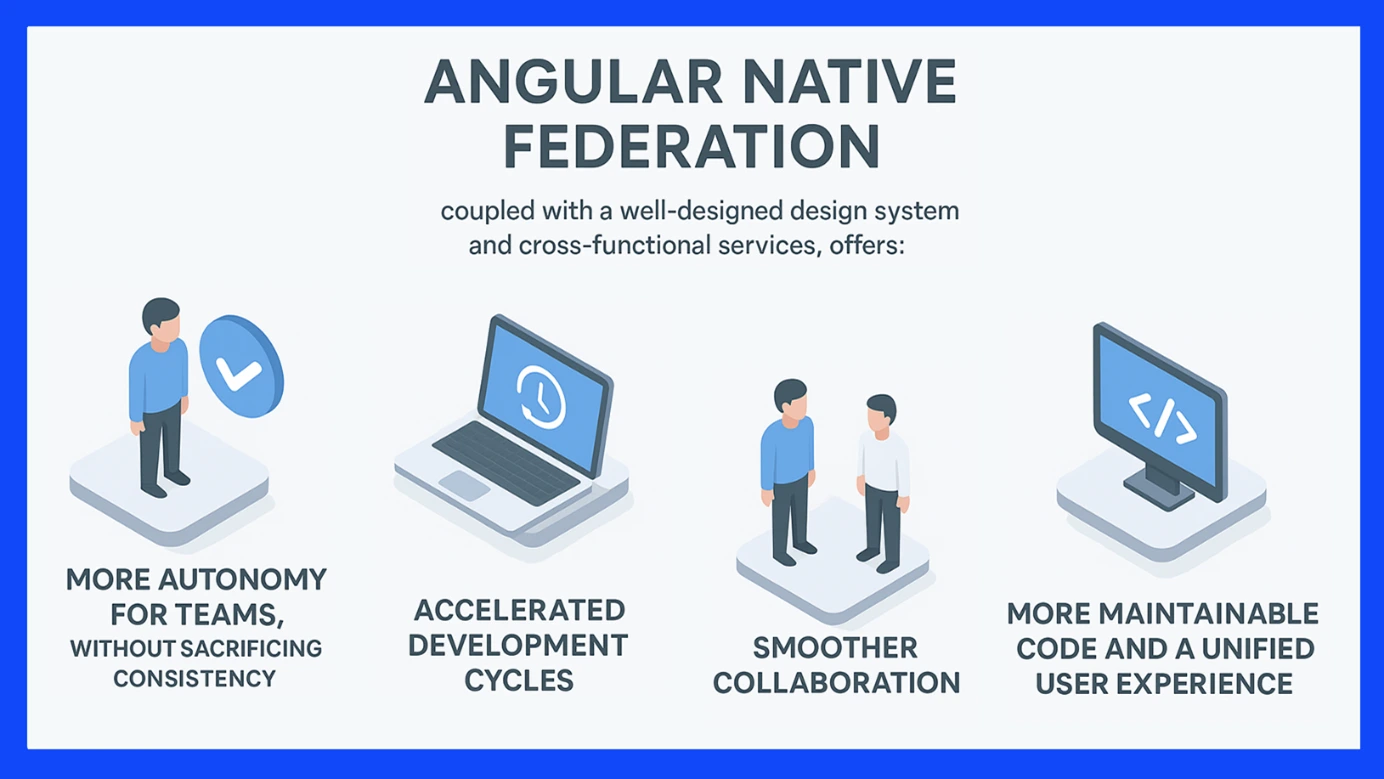 Angular Native Federation, couplé à un design system et à des services transverses bien conçus, offre :- Plus d’autonomie pour les équipes, sans sacrifier la cohérence.
